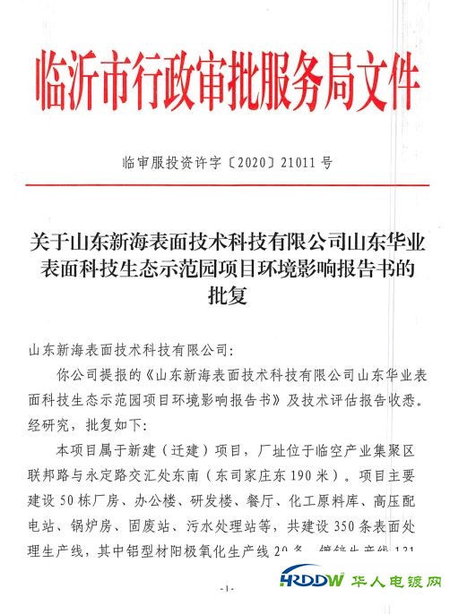 批复指出,废水预处理设施出口水质中总镍、总铬、六价铬和总银浓度须满足《电镀污染物排放标准》(GB21900-2008)表2要求;厂区总排污口水质污染物须满足《污水排入城镇下水道水质标准》(GB/T31962-2015)A级标准要求及临空产业集聚区污水处理厂进水水质要求。一般固体废物暂存应符合《一般工业固体废物贮存、处置场污染控制标准》(GB18599-2001)及修改单相关要求;危险废物暂存须符合《危险废物贮存污染控制标准》(GB18597-2001)及修改单相关要求。根据《临沂市建设项目污染物总量确认书》(LYZL〔2020〕001号)要求,项目COD、氨氮、SO2. NOx排放量应分别控制在32.94t/a、1.647t/a、3.71t/a、25. 8961t/a以内。根据《临沂市建设项目重金属污染物总量确认书》(LYZJS〔2020〕01号)要求,本项目总铬、总镍、总银、总铜、总锌排放量应分别控制在0.079883t/a、0.044088t/a、0.011t/a、 0.195338t/a、0.541907t/a以内;烟粉尘排放量共计3.064t/a,VOCs排放量共计9.399t/a ,硫酸雾排放量共计2.968t/a,氯化氢排放量共计9.4597t/a,铬酸雾排放量共计0.166t/a,铬酸雾含铬量排放量共计0.073t/a。2020年1月6日,临沂市生态环境局河东分局为该项目出具了《关于对征求山东新海表面技术科技有限公司山东华业表面科技生态示范园项目区域替代实现主要大气污染物削减的说明》,对烟粉尘、S02. NOx、挥发性有机物进行了2倍削减量替代。项目建成后全厂进入临空产业集聚区污水处理厂处理的废水COD、氨氮排放量分别为329.4t/a、32.94t/a。