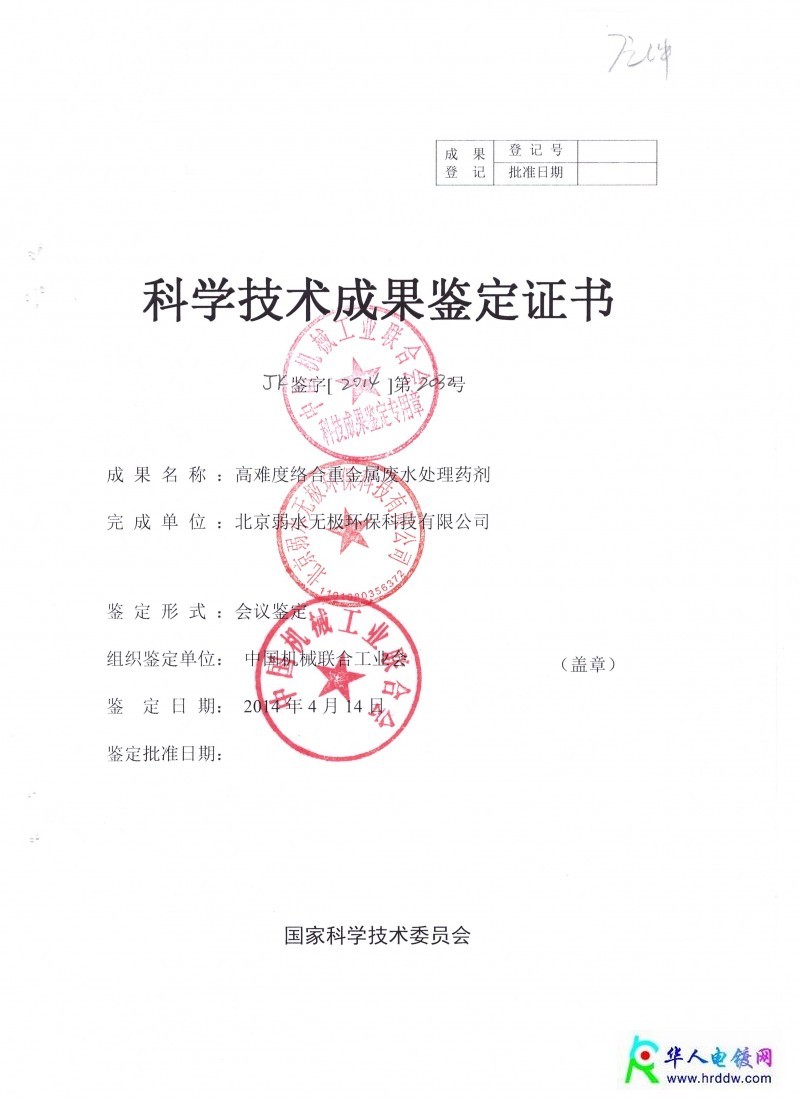 证书介绍 ![]() 国家科学技术委员会科学技术成果鉴定证书_清华大学_弱水无极 北京(昆山)弱水无极环保科技有限公司,系清华大学研究生技术团队创建。专利:重金属捕集剂RS100、络合废水处理剂RS200、破氰剂、除磷剂、除镍剂、除络剂等。专注于电镀废水处理、线路板废水处理、化学镍废水处理、锌镍合金废水处理等重金属废水,均达到国家表三标准。 证书图片 |