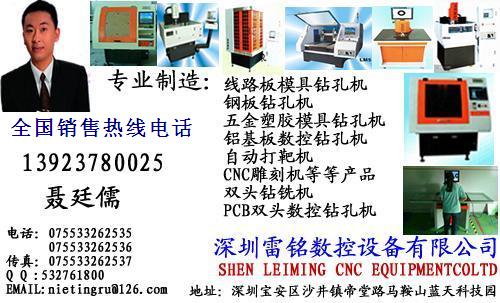 深圳雷铭数控设备有限公司是一家集研发,设计,生产经营为一体的高新科技企业,以市场为导向,致力于数控机床的研制开发。主要产品线路板模具钻孔机,五金模具钻孔机,塑胶模具钻孔机,钢板钻孔机,PCB数控钻孔机,铝基板双头数控钻孔机、双头钻铣床,自动打靶机、雕刻机、数控v割机等多种数控产品。秉承传统机床的生产工艺,融入现代机床设计理念,尽力于解决客户在使用过程中的实际问题,技术已达国内同行业的先进水平。深受客户的信赖和赞扬!