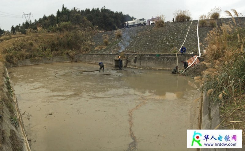 在桃源县陬市镇青龙村连鱼口组堆放工业废料护坝的下游沉淀池内,施工人员将原本红色的水排出,然后清淤。据晟通集团常德产业园负责人介绍,清淤结束后,将请湖南省环境科学研究所重新规划设计沉淀池,以实现达标排放。