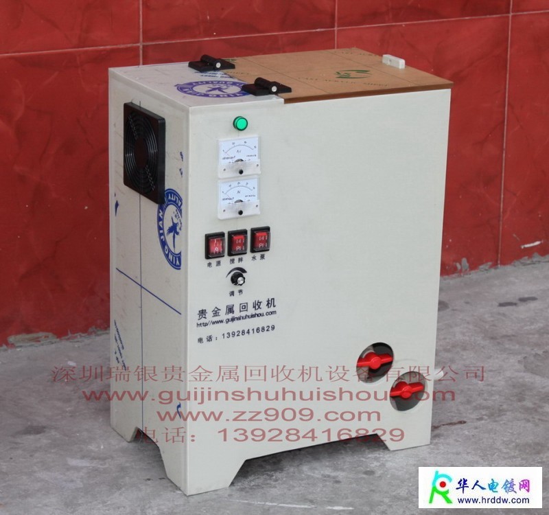 深圳瑞银贵金属回收机设备有限公司,电话:13928416829 专业从事镀金水、镀银水、菲林水等含有贵金属废水的回收机设备,自1999年至今不断的学习、创新、吸收消化国内外先进科技成果,经过上百次的实验、更新技术,自主研发生产高频脉冲贵金属电解回收机设备,采用全自动的知能控制方式,能有效的将银(或金)离子直接还原成金属块,纯度高达99.8%以上的闪闪发光的金、银!是镀金水、镀金水、菲林水等回收的最佳选择!