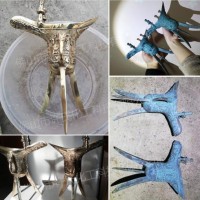 2、发黑后水洗干净直接浸入417铜绿做旧剂,完全浸没即取出。时间长易咬底,影响附着力。浸好铜绿后应轻微抖掉多余的浮液,以免沟缝处铜绿堆积过多。在铜绿自然干燥前,不能水洗。